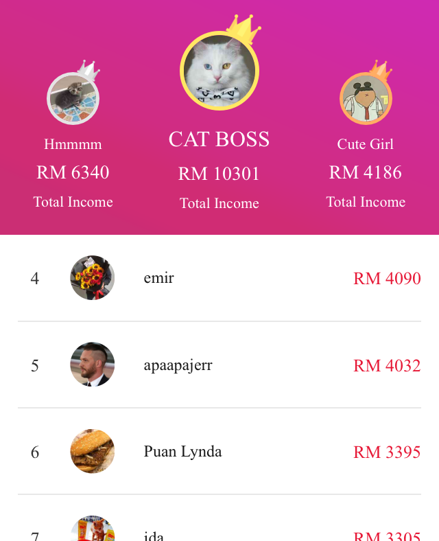 Mungkin selepas ini, akauna anda akan tersenarai di dalam ranking ini. Ianya bagi ranking income today dan juga total income. Ada individu sudah berjaya RM10000 woi. Masyuk Cat Boss