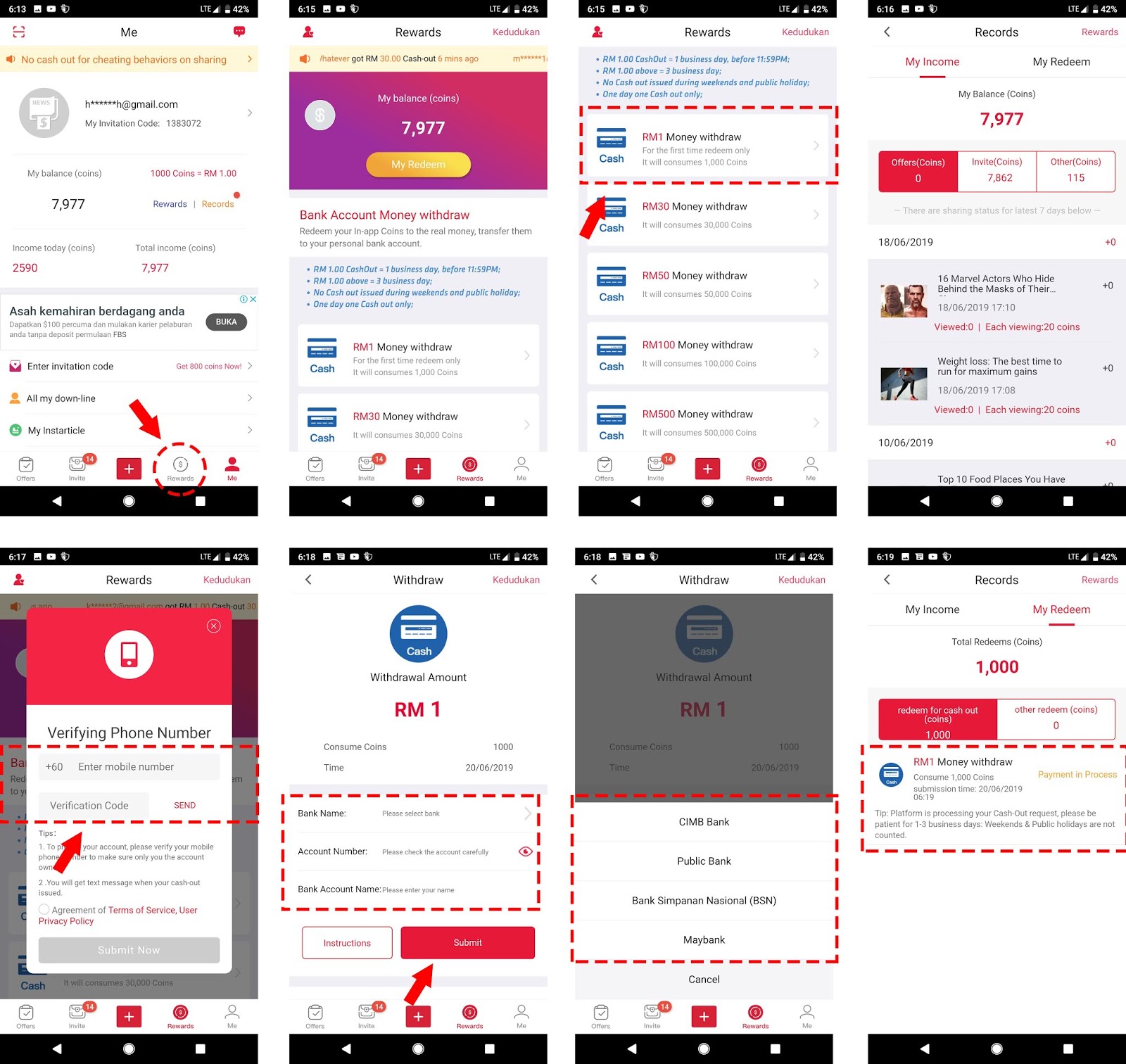 Selepas berjaya memohon cashout, anda akan diberi emel menyatakan permohonan anda untuk cashout ke akaun bank berjaya. Jadi anda perlu tinggu 7-12 jam pula untuk masuk ke akaun bank anda.